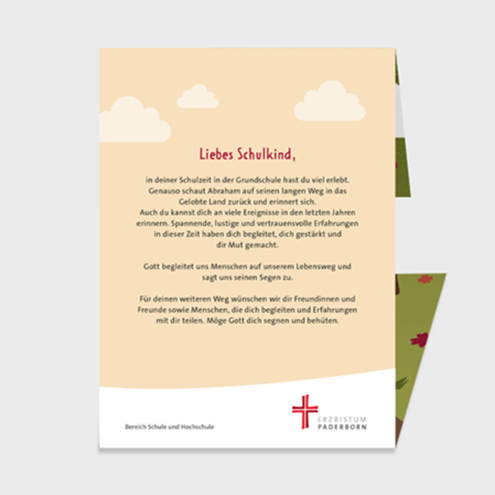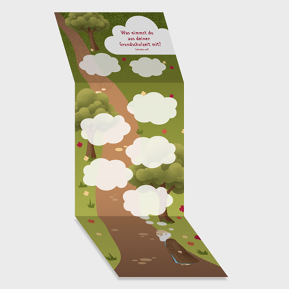 Die Klappkarte erinnert an einen Schulranzen. Innen zeigt sie einen Weg mit Feldern, die von den Schülerinnen und Schülern ausgefüllt werden können.