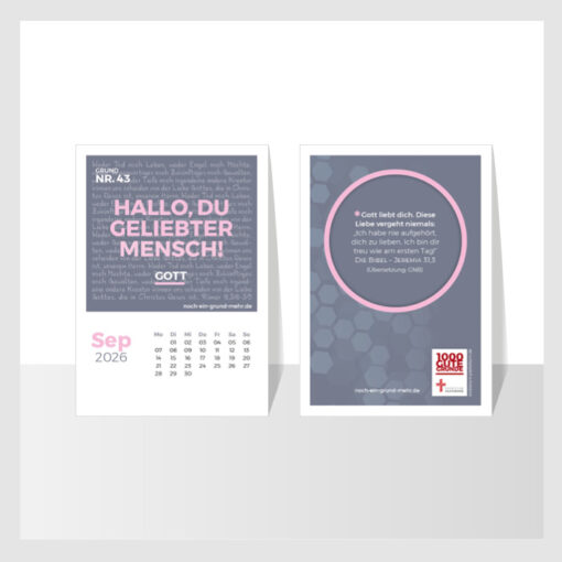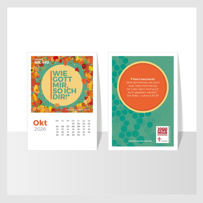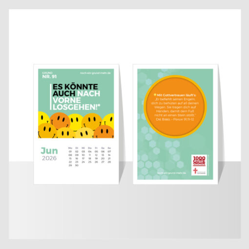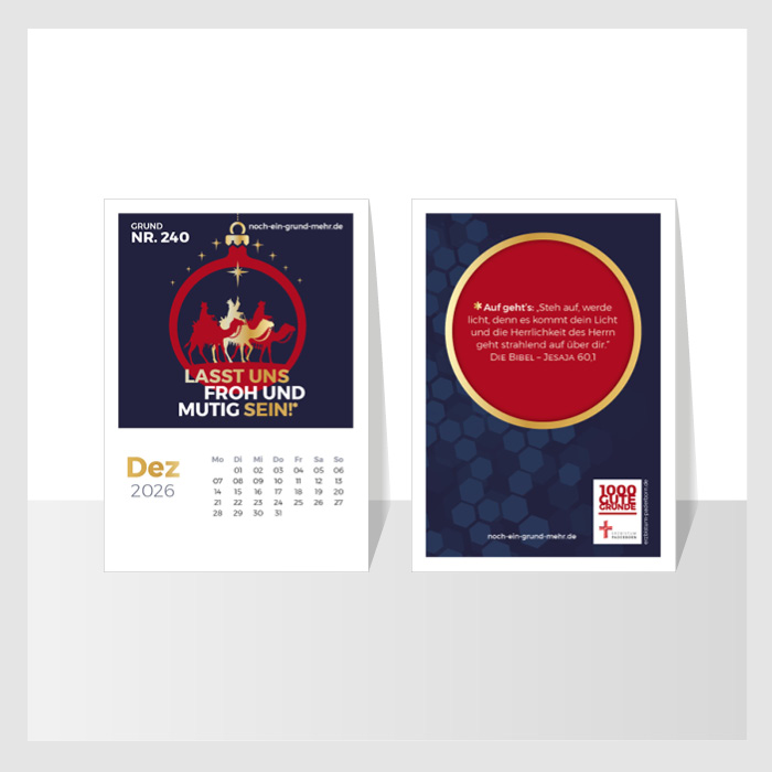 Hinweis: Der Tischkalender mit 12 Postkartenmotiven aus der Initiative 1000 Gute Gründe begleitet ermutigend durch 2026. Er macht sichtbar: Wir stehen auf gutem Glaubens-Grund – Tag für Tag, Monat für Monat, das ganze Jahr hindurch.