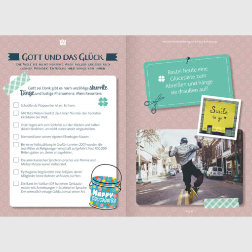 Hinweis: Das Workbook ist ein inspirierendes Mitmachbuch für Jugendliche, die kreativ, unterhaltsam und im eigenen Tempo den Glauben in ihrem Leben entdecken wollen. Mit vielen Anregungen, kleinen Selbsterforschungen, die Spaß machen, praktischen Übungen und positiven Impulstexten. Mal gibt es etwas zum Ausfüllen, Ankreuzen und Aufschreiben, mal zum Nachdenken und Ausprobieren.